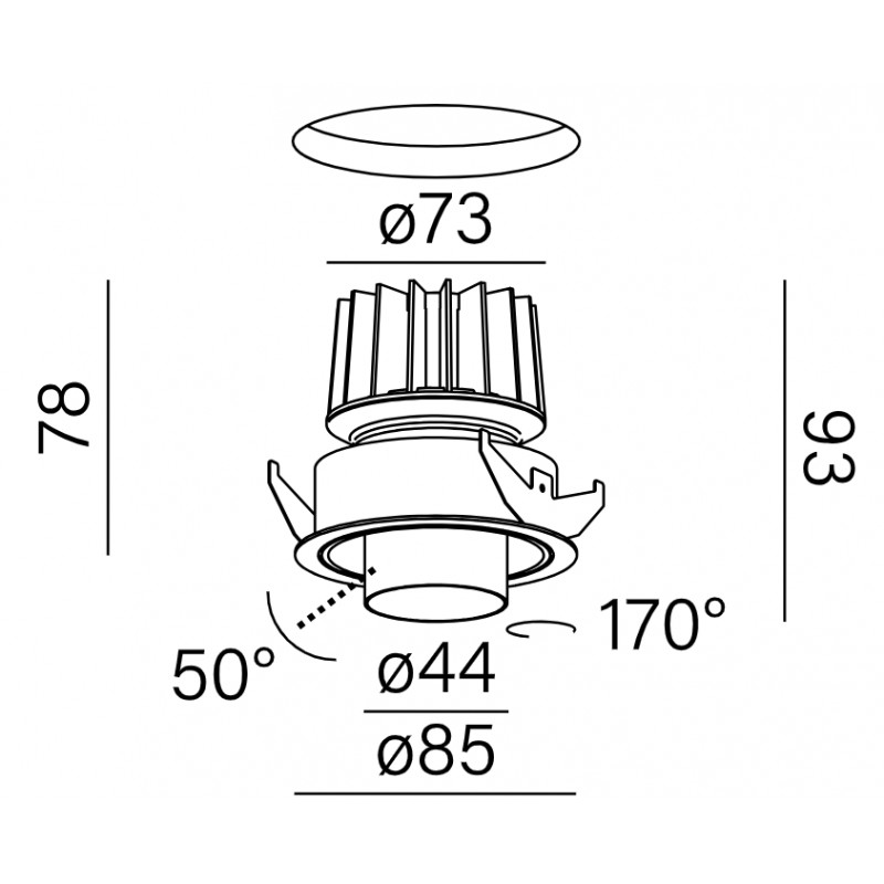 Oprawa występuje w wariantach adjustable i medium power, z kątami świecenia 33° lub 54°, co umożliwia precyzyjne sterowanie strumieniem światła. Montaż podtynkowy (Φ78 mm, Hmin 90 mm) sprawia, że oprawa jest niemal niewidoczna, a jednocześnie nadaje wnętrzu elegancki i nowoczesny charakter.