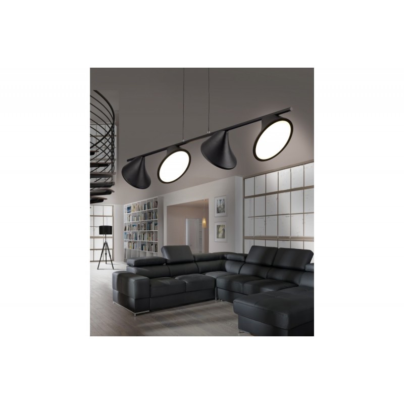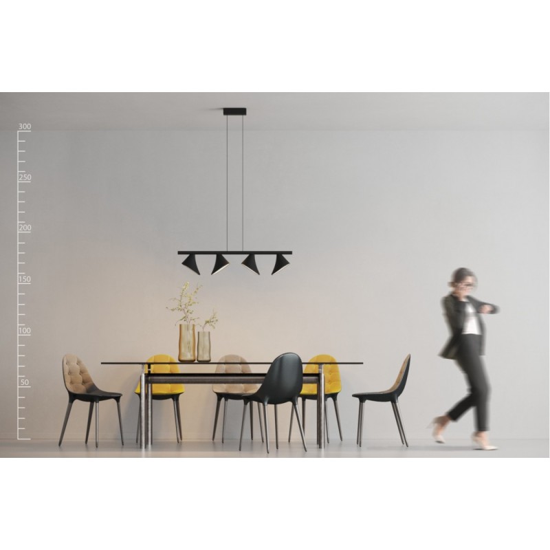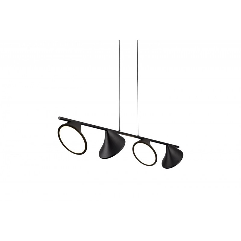 Azzardo CLAMOR to produkt podwieszony na długich przewodach do sufitu. Na poprzecznym elemencie mocującym umieszczono cztery oprawy oświetleniowe o stożkowatym kształcie, wykonane z aluminium (czarny mat). Osadzono w nich zintegrowane źródła światła LED, przykryte białymi osłonami z akrylu. Produkt odznacza się sporą energooszczędnością, pozwalając znacznie obniżyć zużycie prądu w porównaniu do klasycznych żarówek, przy równoczesnym zachowaniu wysokiego komfortu oświetleniowego.