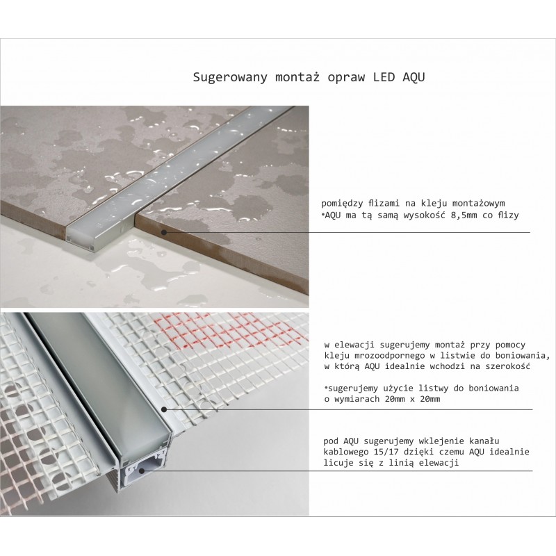 Na elewacjach rekomendujemy montaż w listwie do boniowania o wymiarach 20×20 mm z użyciem kleju mrozoodpornego. AQU idealnie wchodzi na szerokość listwy, tworząc czystą, równą linię światła.