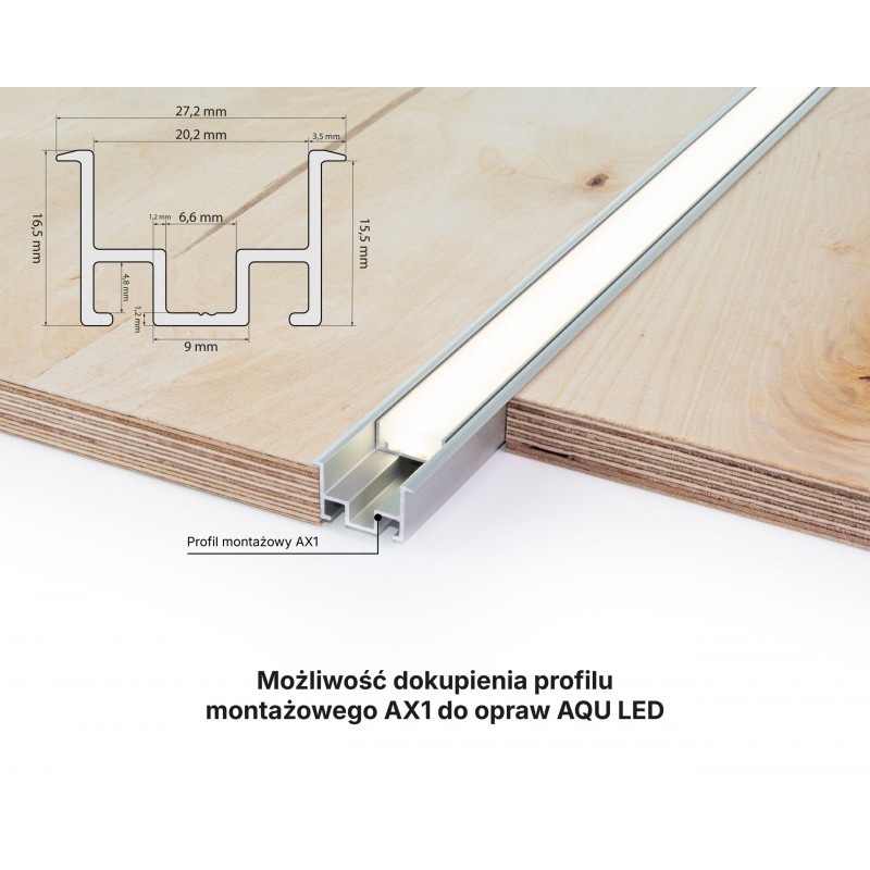 Montuje się go na klej montażowy w ścianie, suficie, podłodze lub meblu. Po utwardzeniu kleju oprawę AQU wkleja się w profil na silikonie.