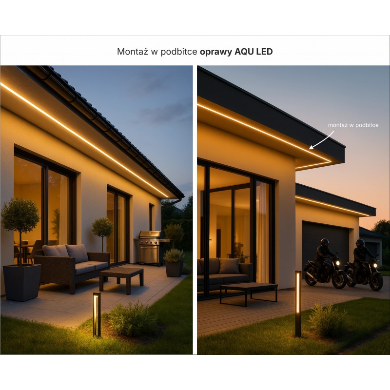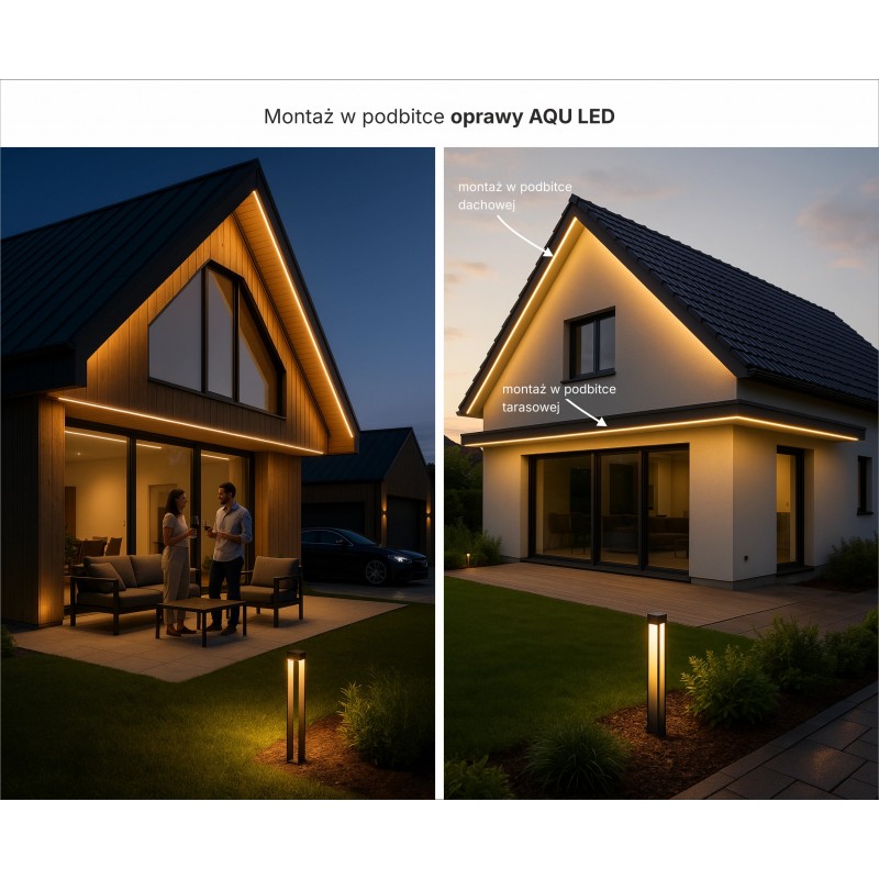 Podbitka dachowa – W podbitkach dachowych AQU zapewnia ciągłą linię światła bez widocznych punktów LED, idealną do oświetlenia obwodu budynku. Odporność na wilgoć, kurz i promieniowanie UV gwarantuje wieloletnią trwałość, a montaż w szczelinie między panelami podbitki pozwala uzyskać czysty, minimalistyczny efekt świetlny.
