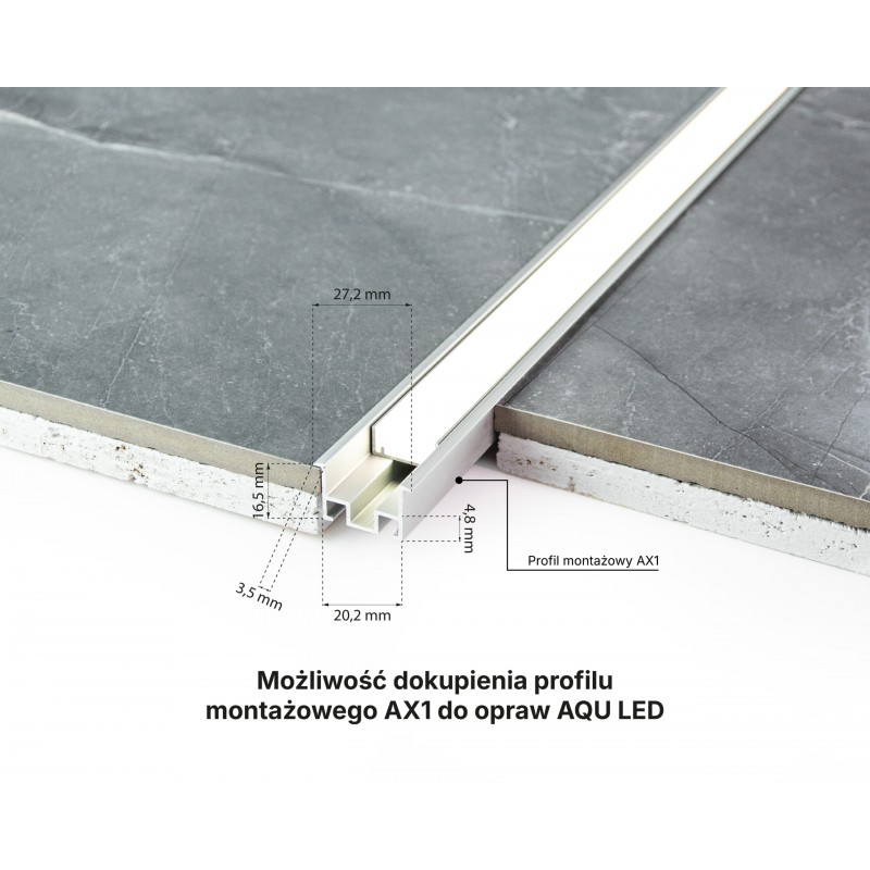 Oprawa AQU ma wysokość 8,5 mm, czyli dokładnie tyle, ile większość płytek gresowych, dzięki czemu idealnie licuje się z powierzchnią po zamontowaniu.