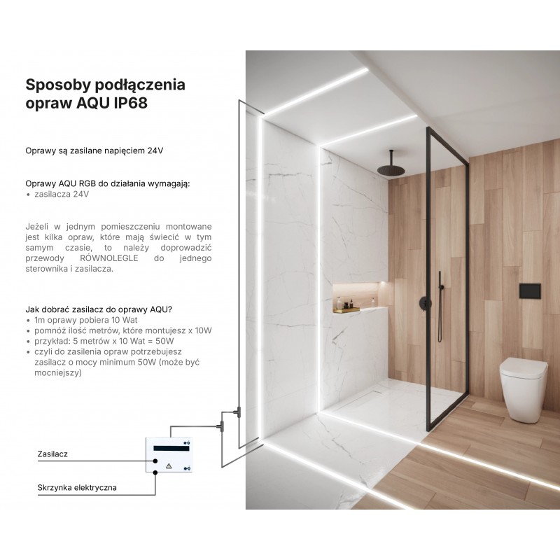 Oprawa liniowa AQU zasilana jest bezpiecznym napięciem 24V DC. Do prawidłowej pracy wymaga zasilacza 24V sprzedawanego osobno.
