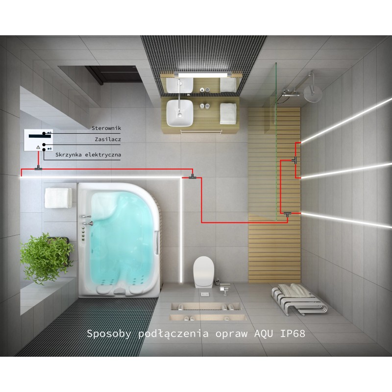 Każda oprawa liniowa AQU wyposażona jest w swój indywidualny przewód zasilający, który należy doprowadzić bezpośrednio do zasilacza 24V DC. Dzięki temu każda oprawa jest w pełni niezależna elektrycznie, co ułatwia montaż, serwisowanie i zapewnia maksymalną szczelność połączeń.