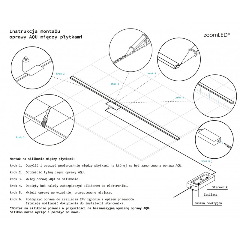 Montaż polega na wklejeniu oprawy w szczelinę między płytkami lub w przygotowany rowek przy użyciu silikonu.