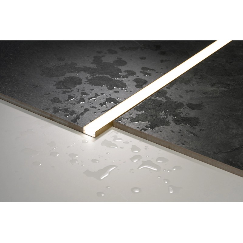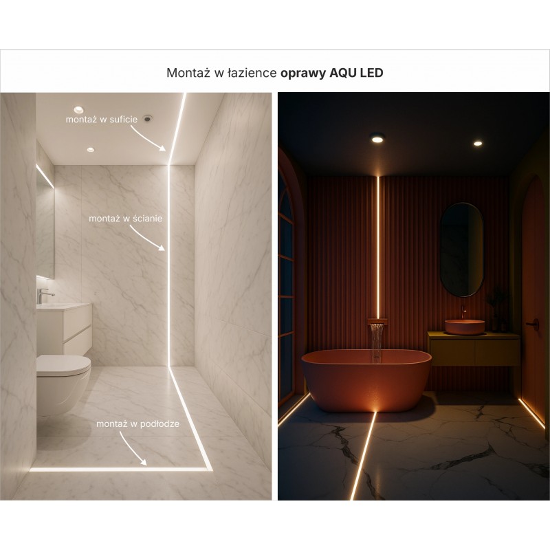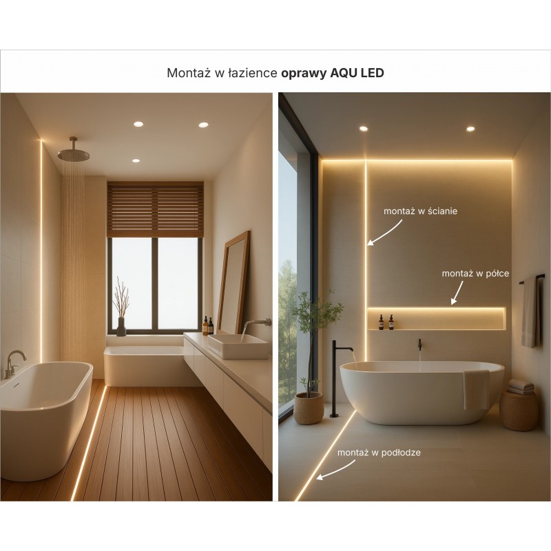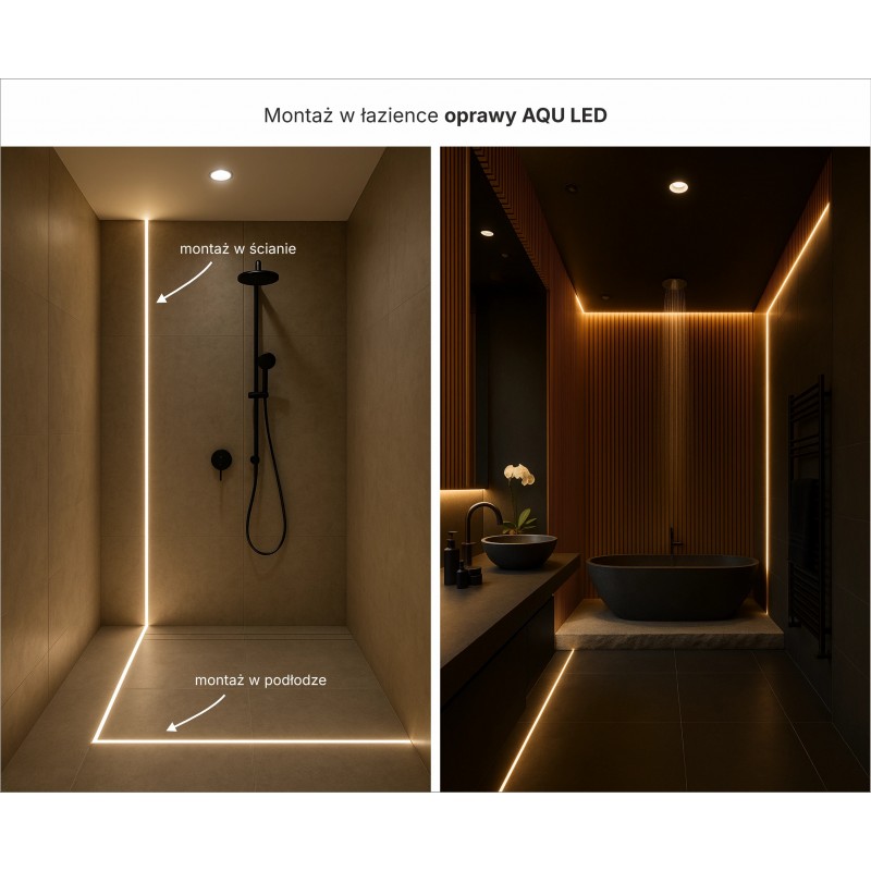 Łazienka -Oprawa AQU doskonale sprawdza się w strefach mokrych – można ją montować między płytkami pod prysznicem, wzdłuż wanny lub przy podłodze, tworząc eleganckie, nastrojowe oświetlenie. Dzięki pełnej szczelności IP68 jest odporna na wodę i parę, a jej równomierne światło podkreśla nowoczesny charakter wnętrza i ułatwia orientację nocą.