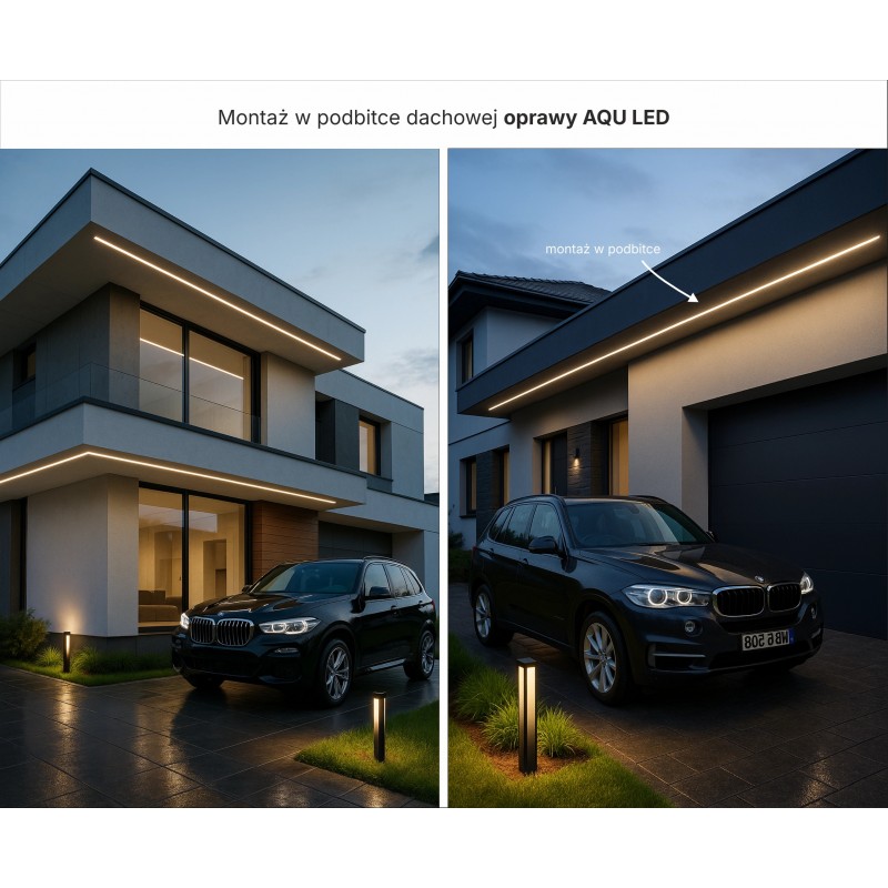 Podbitka dachowa – W podbitkach dachowych AQU zapewnia ciągłą linię światła bez widocznych punktów LED, idealną do oświetlenia obwodu budynku. Odporność na wilgoć, kurz i promieniowanie UV gwarantuje wieloletnią trwałość, a montaż w szczelinie między panelami podbitki pozwala uzyskać czysty, minimalistyczny efekt świetlny.