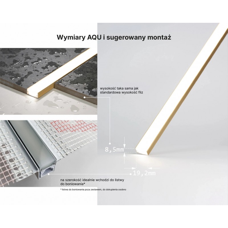 Na elewacjach rekomendujemy montaż w listwie do boniowania o wymiarach 20×20 mm z użyciem kleju mrozoodpornego. AQU idealnie wchodzi na szerokość listwy, tworząc czystą, równą linię światła.