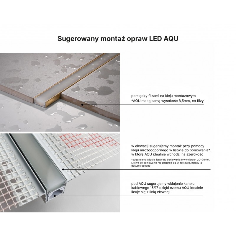 Montuje się go na klej montażowy w ścianie, suficie, podłodze lub meblu. Po utwardzeniu kleju oprawę AQU wkleja się w profil na silikonie.
