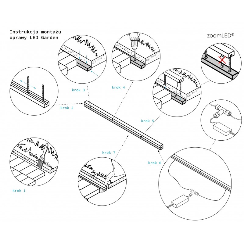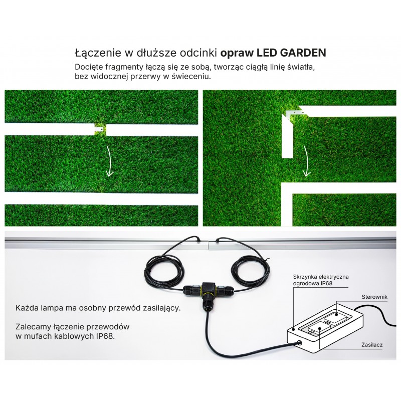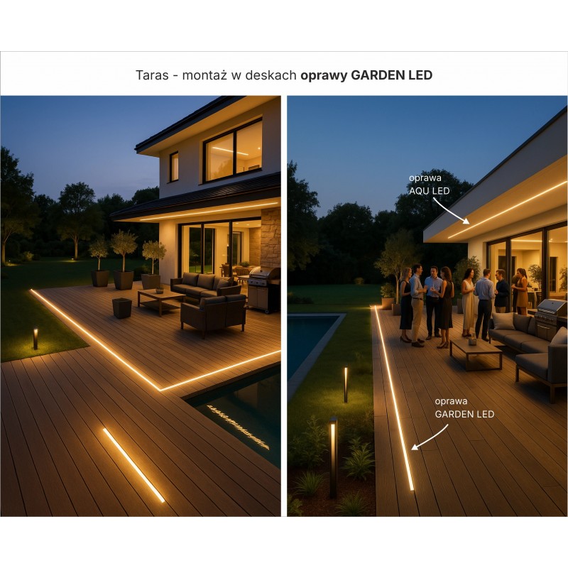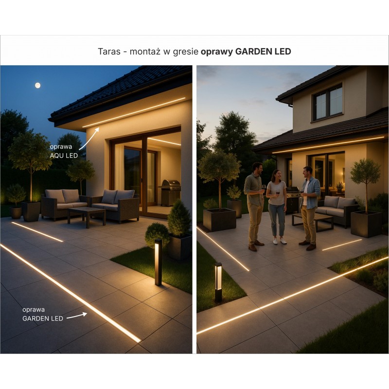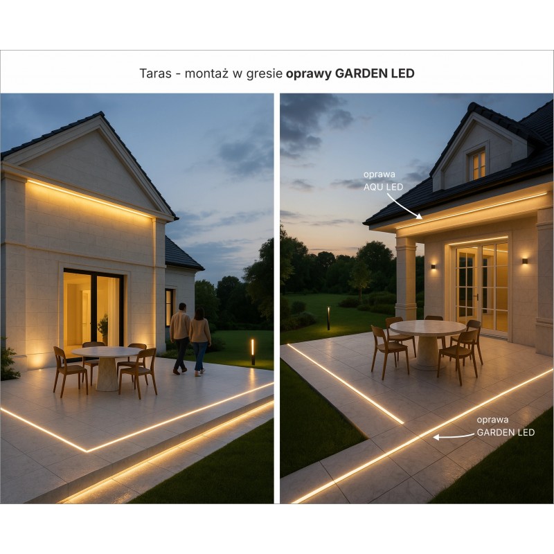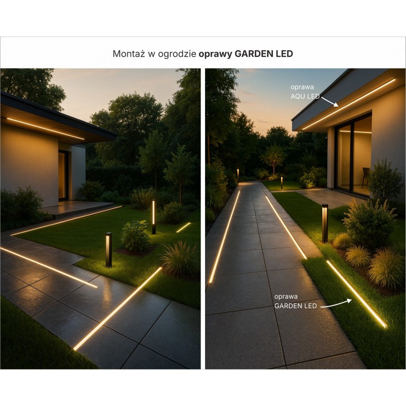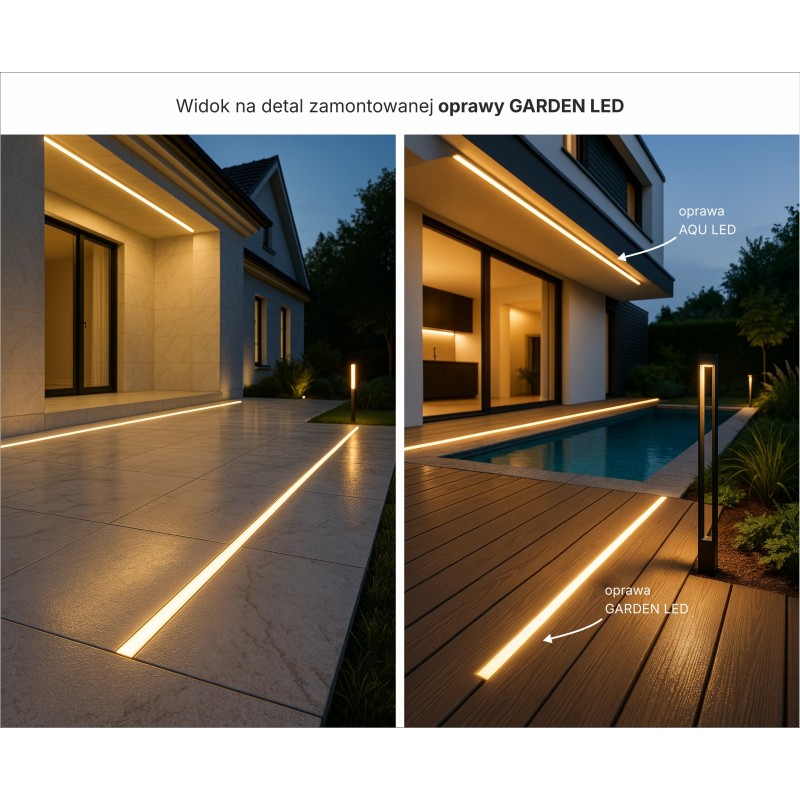 Gotowa do montażu i podłączenia oprawa LED GARDEN, do tworzenia ozdobnych linii światła, po których można chodzić, jeździć samochodem, polewać wodą a nawet zanurzać w basenie. Odporna na promienie UV oraz na nacisk.