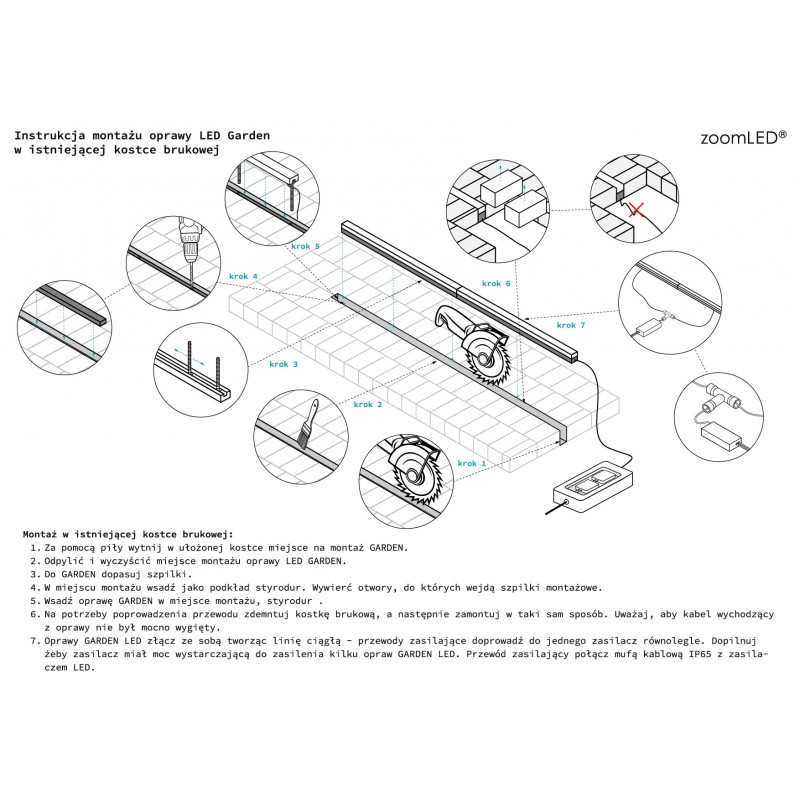 *przy montażu w kostce brukowej, zalecamy osadzenie lampy na materiale styrodur, który amortyzuje obciążenia i pozwala zlicować lampę z linią kostki brukowej