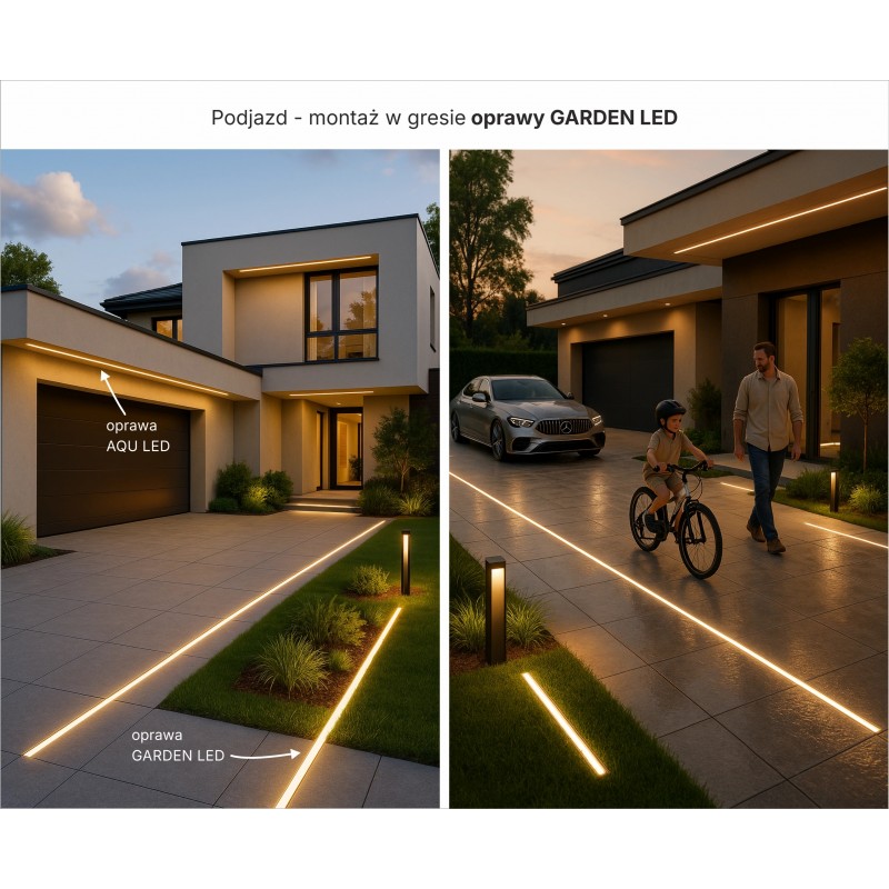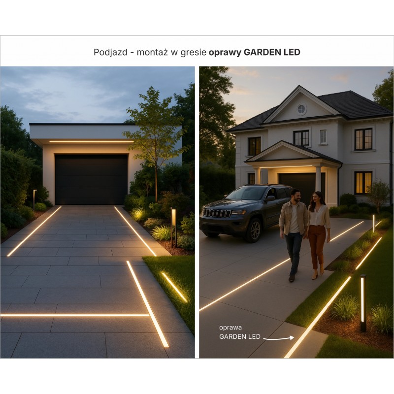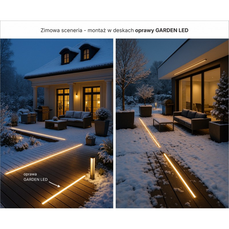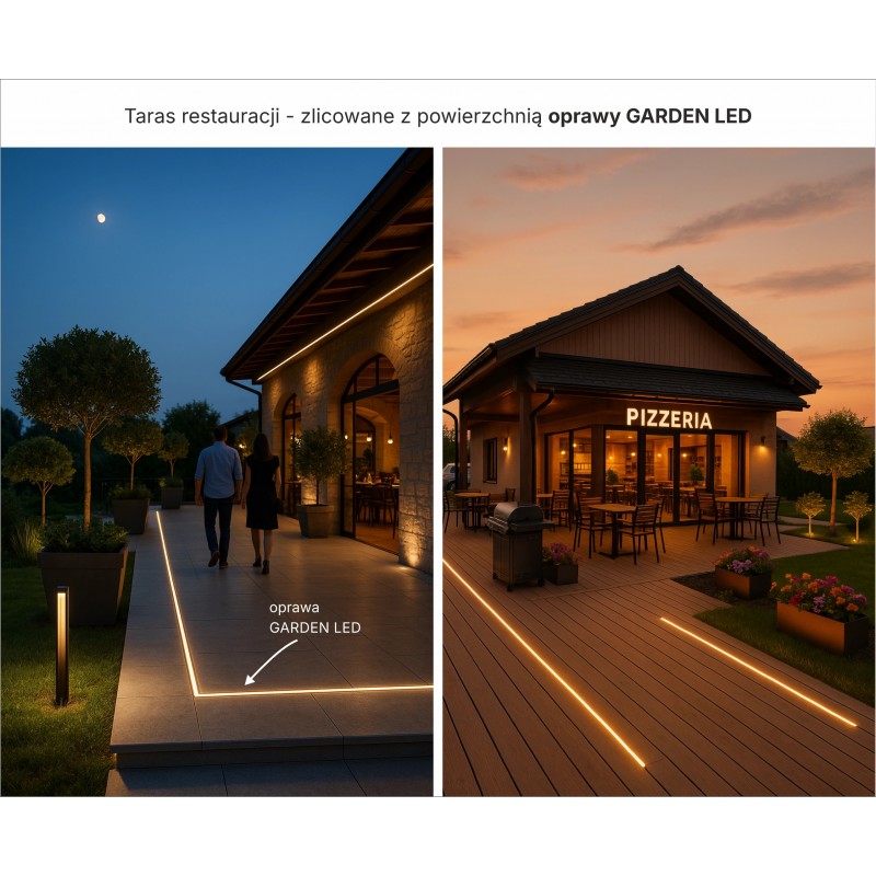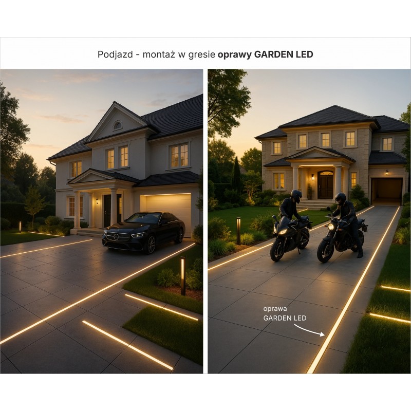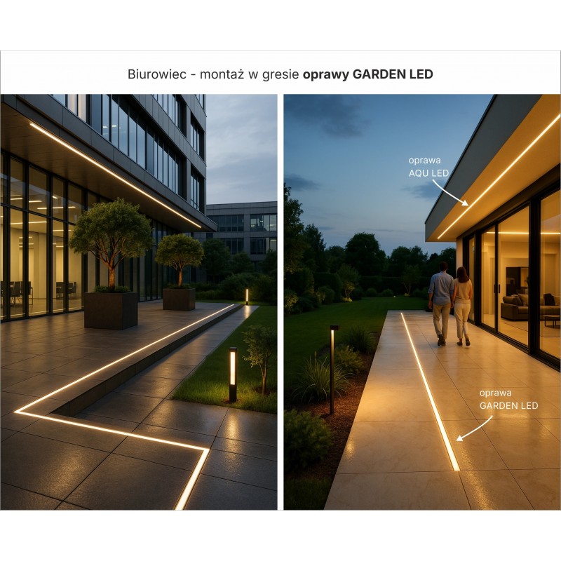 • Oprawy LED GARDEN można montować na zewnątrz np: w chodniku, w trawniku, na elewacji budynku oraz wewnątrz tworząc ozdobne linie światła
