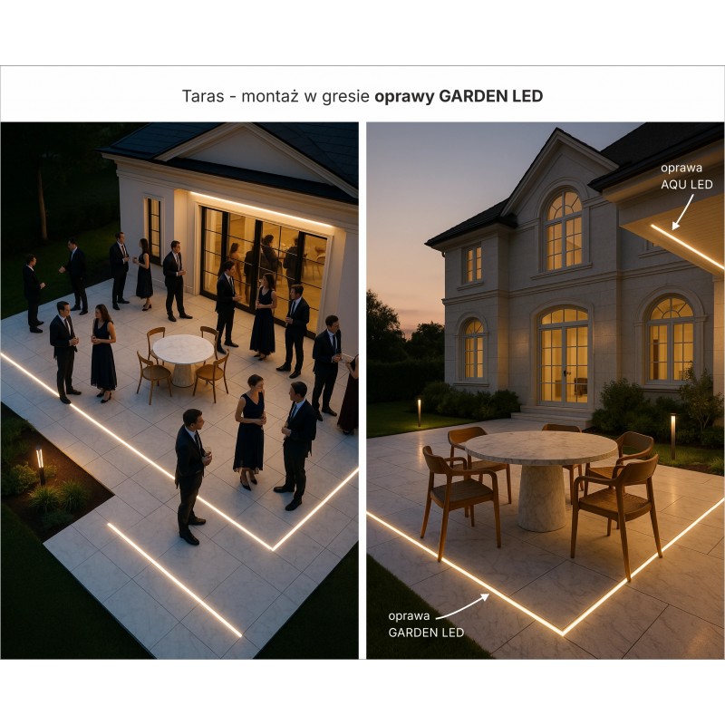 Gotowa do montażu i podłączenia oprawa LED GARDEN, do tworzenia ozdobnych linii światła, po których można chodzić, jeździć samochodem, polewać wodą a nawet zanurzać w basenie. Odporna na promienie UV oraz na nacisk.
