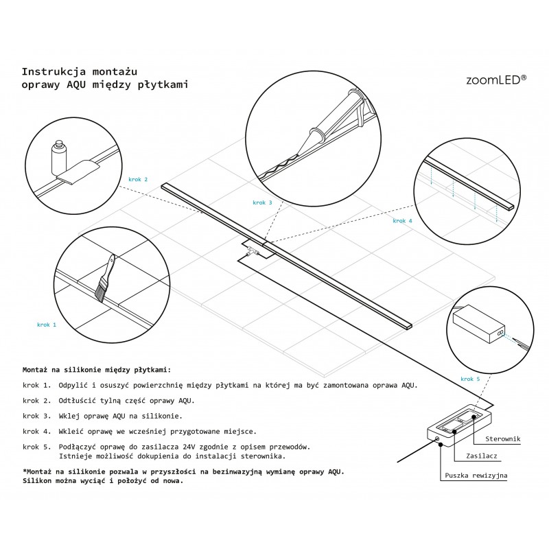 Montaż polega na wklejeniu oprawy w szczelinę między płytkami lub w przygotowany rowek przy użyciu silikonu.