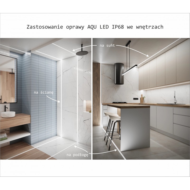 Łazienka -Oprawa AQU doskonale sprawdza się w strefach mokrych – można ją montować między płytkami pod prysznicem, wzdłuż wanny lub przy podłodze, tworząc eleganckie, nastrojowe oświetlenie. Dzięki pełnej szczelności IP68 jest odporna na wodę i parę, a jej równomierne światło podkreśla nowoczesny charakter wnętrza i ułatwia orientację nocą.