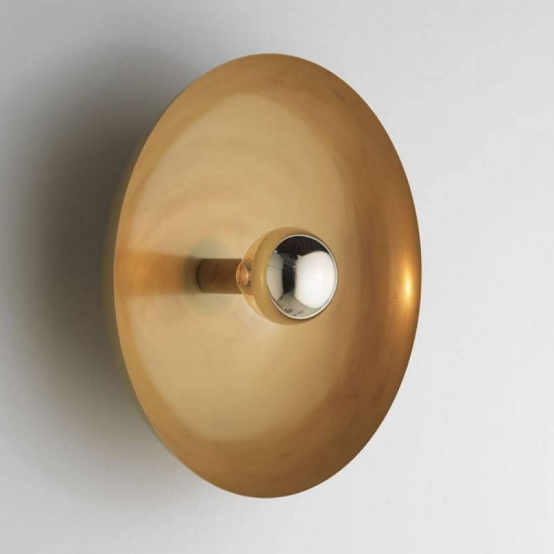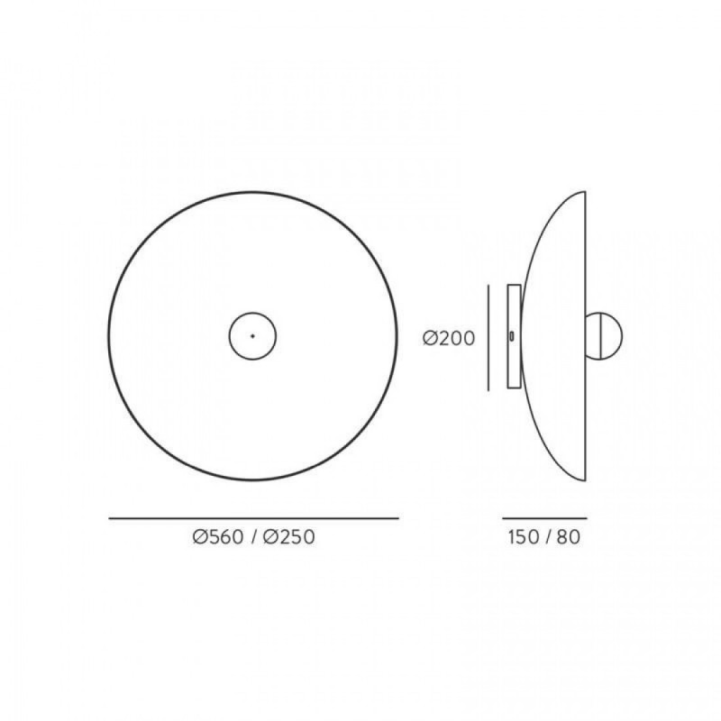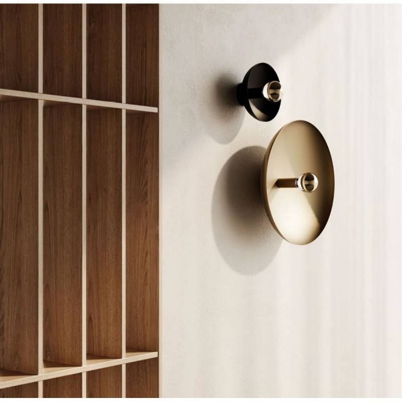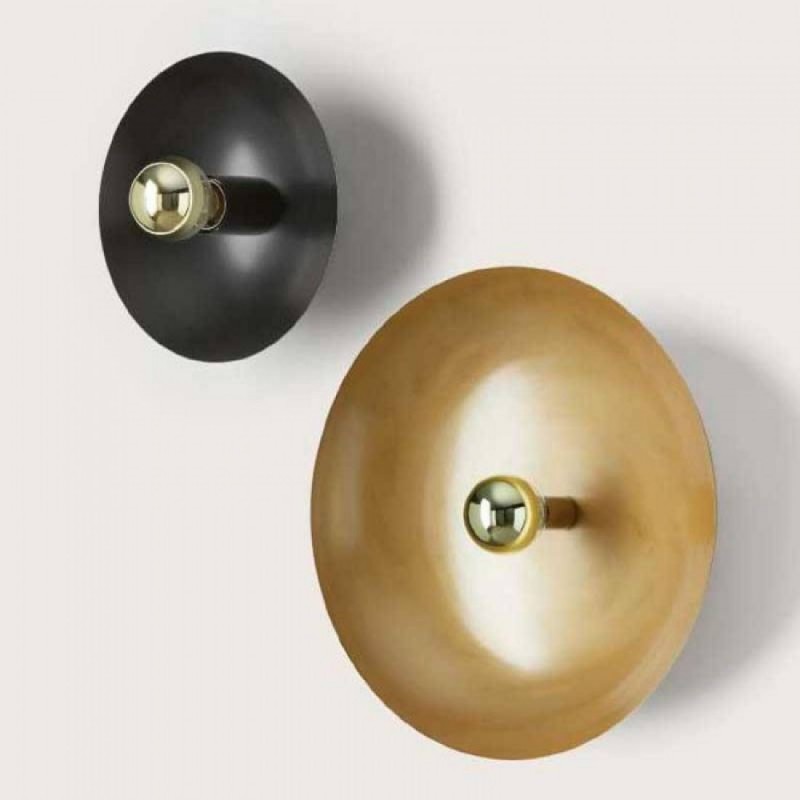 Kinkiet CROPI Aromas to designerska lampa ścienna o minimalistycznej, okrągłej formie, dostępna w dwóch średnicach (Ø25 cm i Ø56 cm) oraz w wykończeniach czarnym i postarzanego złota. Projekt autorstwa Pepe Fornás wyróżnia się prostotą i elegancją – centralnie umieszczona żarówka E27 (max 60W) osadzona jest w stalowym, wklęsłym kloszu.