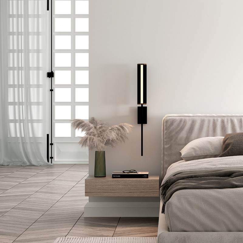 Kinkiet NIRO od Aromas to nowoczesna, minimalistyczna lampa ścienna o wysokości 70 cm, dostępna w kolorze czarnym matowym lub złotym. Wyposażona jest w zintegrowany pasek LED 8W (700 lm, 2700K), z możliwością ściemniania.