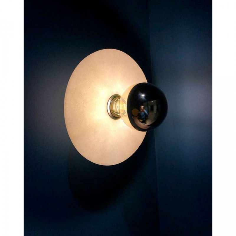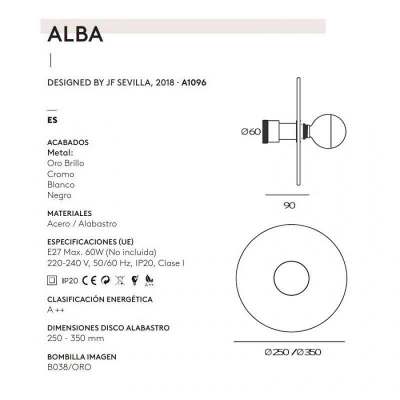Kinkiet ALBA A1053+1096 Aromas to elegancka lampa ścienna z alabastrowym dyskiem Ø25 cm, dostępna w kilku wariantach kolorystycznych (złoto, chrom, biały, czarny). Wykonana ze stali i alabastru, przeznaczona do żarówki E27 max 15W, klasa szczelności IP20