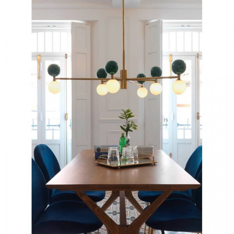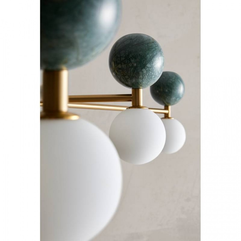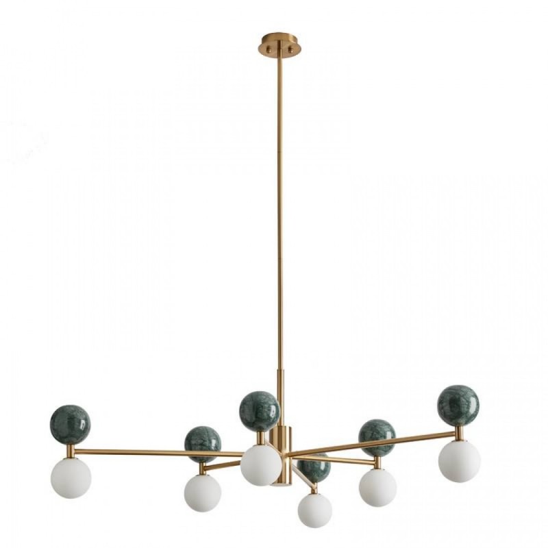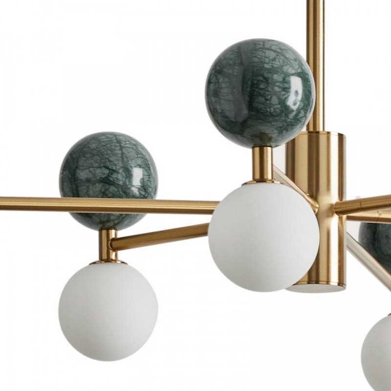 Lampa wisząca Aromas DALT C1280/6 to elegancki model z sześcioma źródłami światła, łączący nowoczesny minimalizm z wyrafinowanymi materiałami – stalą, marmurem i szkłem opalowym. Dostępna jest w wykończeniach czarny mat lub stare złoto, z marmurem w kolorze zielonym lub czarnym.