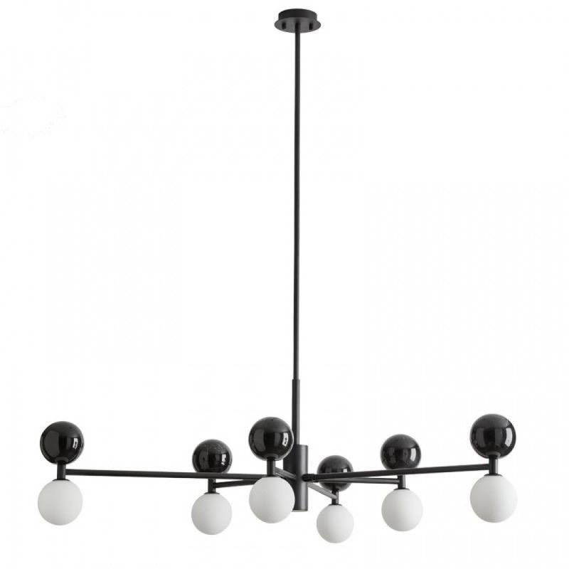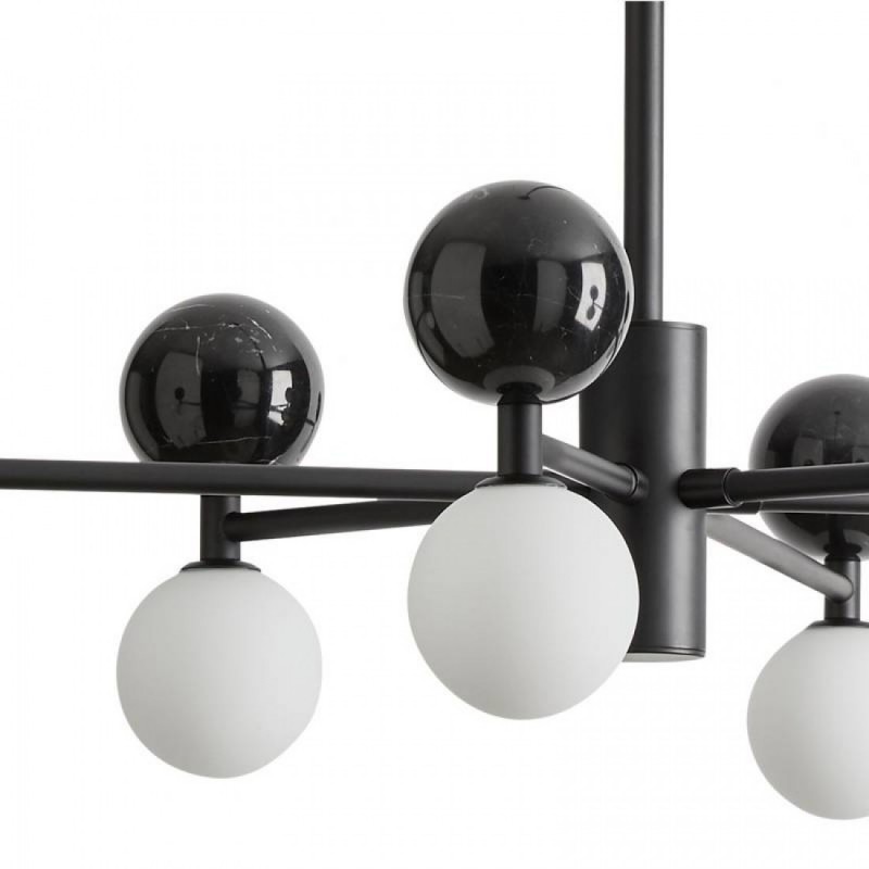 Design: rozłożysta, ale lekka forma – sześć kulistych kloszy z matowego szkła opalowego rozmieszczonych symetrycznie.