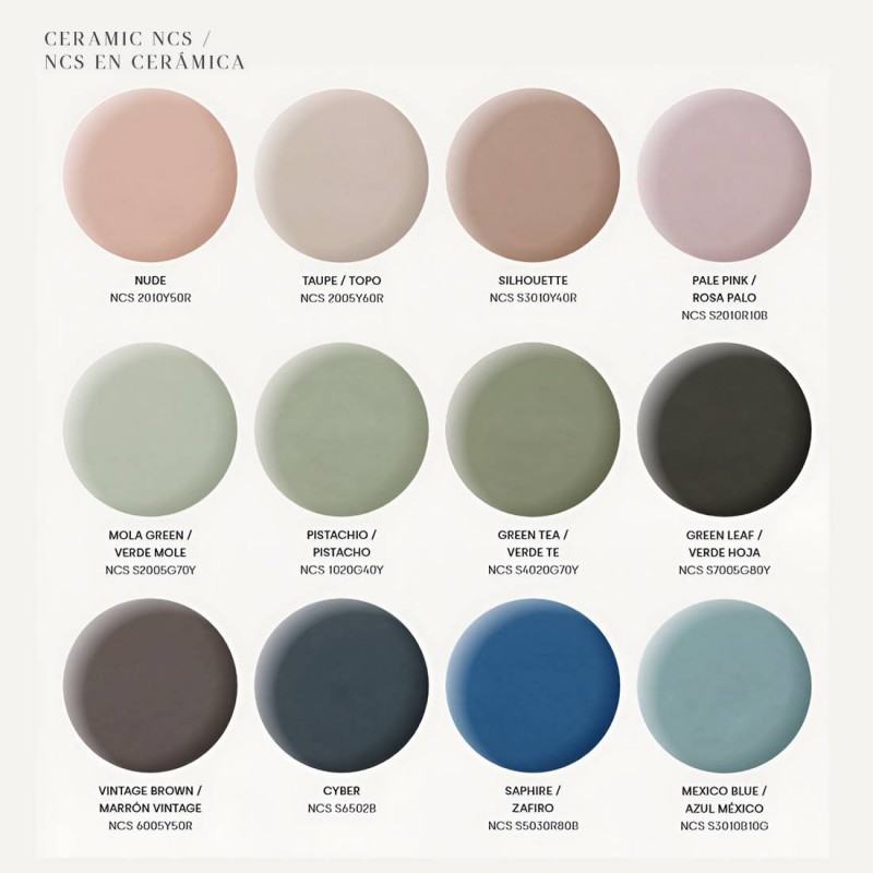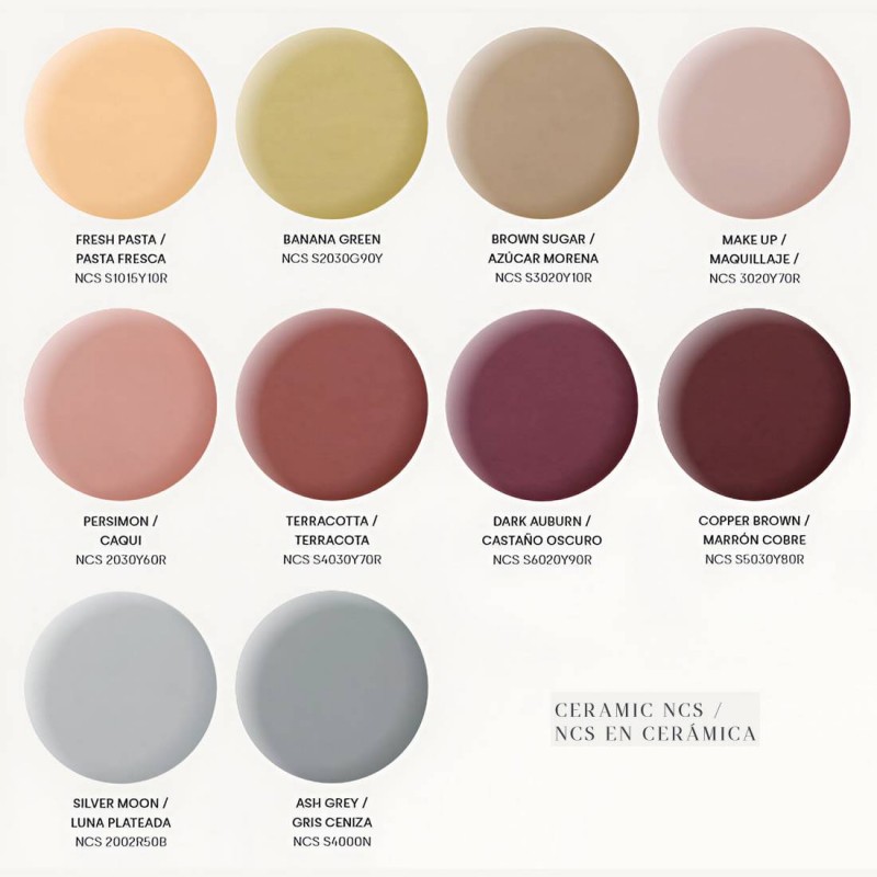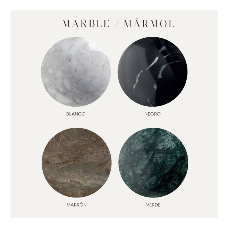 Elementy metalowe dostępne w kolorach: złoty, mosiądz, chrom, czarny, biały. Marmur dostępny w kolorach: biały, czarny, brązowy i zielony. Kolor ceramiki dowolny z palety Aromas.