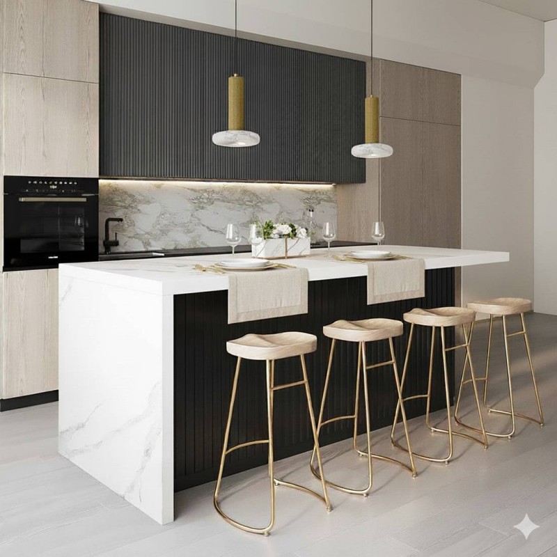 Minimalistyczna forma łącząca metal z eleganckim marmurem.
