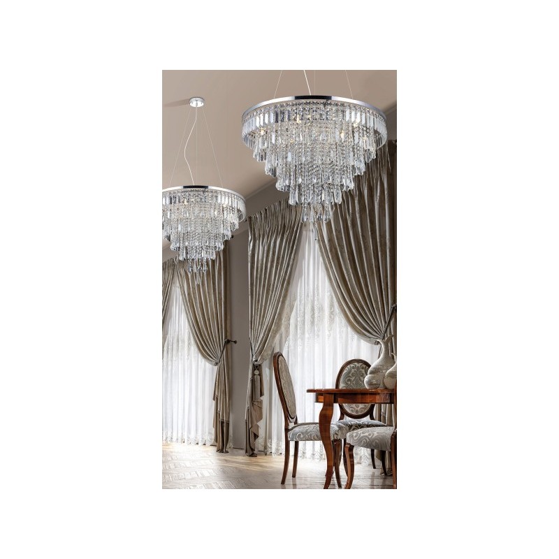 KALABRIA XL PENDANT składa się z kilku pierścieni o różnej średnicy, zawieszonych na różnych wysokościach tak, żeby tworzyły kształt odwróconej piramidy. W jej wnętrzu umieszczono aż 12 źródeł światła. Do powierzchni pierścieni przymocowano natomiast podłużne kryształki egipskie. Światło odbijające się od ich powierzchni tworzy dekoracyjne i piękne refleksy na ścianach i wyposażeniu. Wszystkie elementy konstrukcyjne lampy wykonano z trwałego aluminium w odcieniu chromu, o mocno wypolerowanej powierzchni.