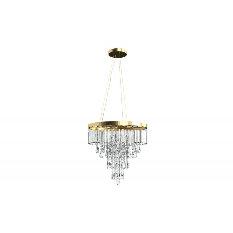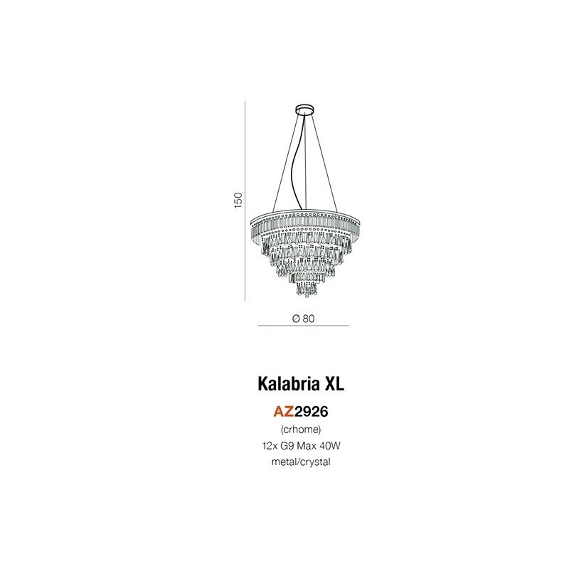 KALABRIA XL PENDANT składa się z kilku pierścieni o różnej średnicy, zawieszonych na różnych wysokościach tak, żeby tworzyły kształt odwróconej piramidy. W jej wnętrzu umieszczono aż 12 źródeł światła. Do powierzchni pierścieni przymocowano natomiast podłużne kryształki egipskie. Światło odbijające się od ich powierzchni tworzy dekoracyjne i piękne refleksy na ścianach i wyposażeniu. Wszystkie elementy konstrukcyjne lampy wykonano z trwałego aluminium w odcieniu chromu, o mocno wypolerowanej powierzchni.