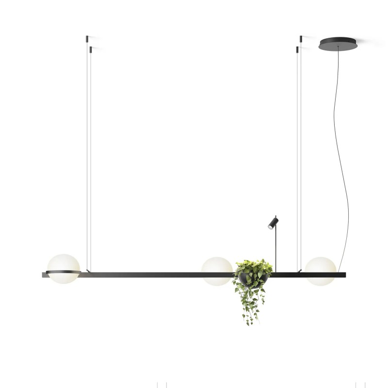 Lampa Palma została zaprojektowana z myślą o integracji z zielenią — posiada doświetloną misę, którą można uzupełnić roślinami, co nadaje wnętrzu naturalny i relaksujący charakter.