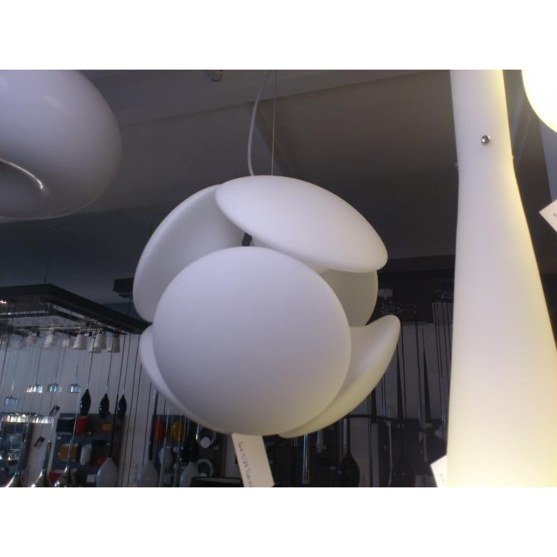 W centrum lampy znajduje się niewielka kula, do której zamontowano sześć kielichów ze srebrzystego metalu. Każdy z nich od zewnątrz jest osłonięty mlecznobiałym szkłem, dzięki czemu lampa daje przyjemne dla wzroku światło rozproszone. Całość jest niezmiernie dekoracyjna i ciekawa wizualnie.