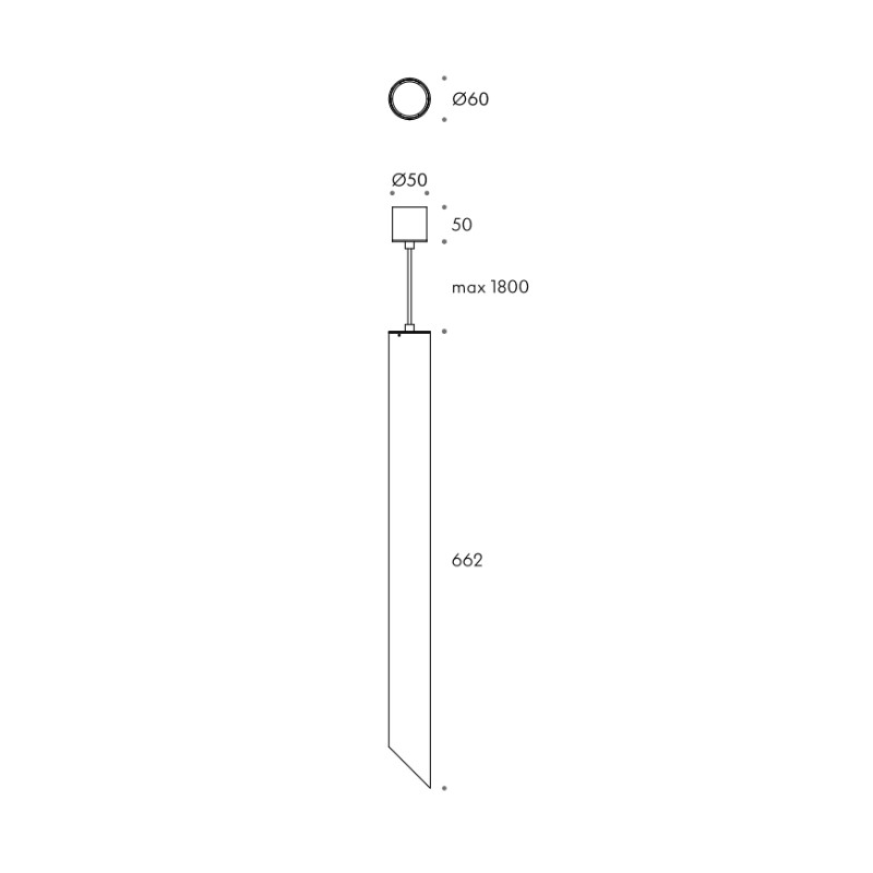 Wymiar : ø60 x h662 mm , wymiary puszki zasil. / max. długość zawiesi: ø50 h50 / h1800